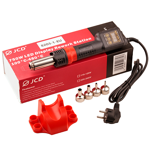 JCD Паяльный фен 750 Вт,цифровой дисплей, керамический нагреватель, 4 насадки