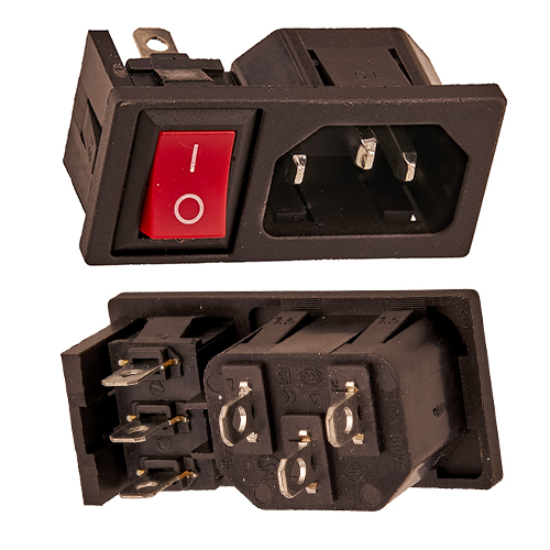 Комбинированный модуль для панельного монтажа, объединяющий стандартный сетевой разъём-вход IEC C-14 («папа») и двухпозиционный выключатель питания в одном компактном корпусе.