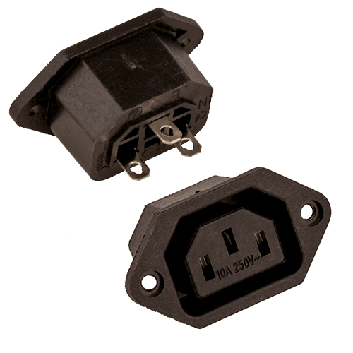 Стандартное гнездо питания (розетка) IEC C-13 для установки на корпус электронных устройств. Обеспечивает надёжное и безопасное подключение к сети переменного тока через стандартный кабель с вилкой IEC C-14 («компьютерный» шнур).